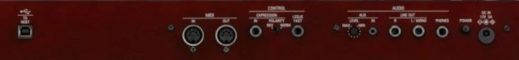 OK in the connectivity department, the M-Solo has a TON. Looking at the back panel, we have a USB to host port so you can connect the M-Solo to a device as a MIDI controller (note that this is MIDI only; there is no audio interface built into this port which is a bit unfortunate). But we do have 5 pin MIDI in and out ports, and this is a VERY important feature for this keyboard in my opinion, in particular the MIDI in port. While the keybed on the M-Solo IS great for such a light and small keyboard, as I mentioned, a proper waterfall style keybed is still FAR better for organ. So having a MIDI in port allows you to connect another keyboard with 61 or more keys and a better organ key action to trigger the awesome sounds on the M-Solo, so you basically get the best of both worlds; like this Hammond SK-1, or even my Numa Compact 2X which has a semi-weighted keybed that IS pretty decent for playing organ).