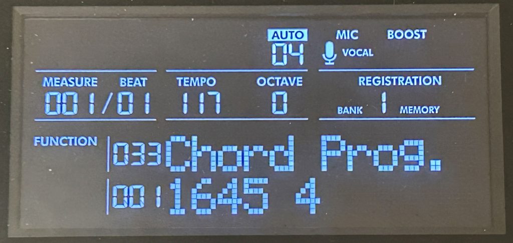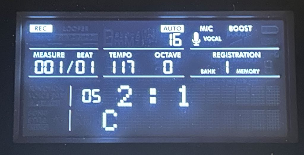 A couple of awesome features with the rhythms and accompaniment that are brought forward from the prior models: first, you can adjust the rhythm & accompaniment volume if you want it adjusted relative to the main voice you are using which is awesome – FYI that’s #30 in the Function menu. Another couple of cool features brought forward are the ability to mute style parts if you want some simpler accompaniment (I often play along with just bass and drums – and this is super easy to do with the backlit style part buttons). And what’s even cooler is the ability to re-voice style parts. So for example, if I really like the 80’s Guitar Pop style, but I don’t like the guitar sound on “Chord1” I can hold down REVOICE and press the CHORD1 button and then choose any voice that I want, like an . . . organ voice.