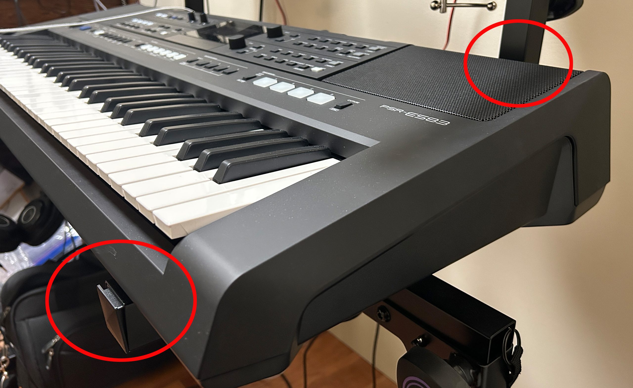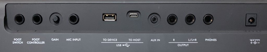There’s been a HUGE new addition in connectivity on the PSR-E583 (which in my opinion justifies going with the E583 vs. the E483 all by itself) and that is a 1/4″ “Foot Controller” port for an expression pedal. It was pretty frustrating not being able to control volume with a pedal on my PSR-EW425. Note that volume control is your ONLY option for this pedal; that’s fine for most users, and it’s also good that Yamaha allows you to specify whether the volume applies to EVERYTHING (so your styles etc) or JUST to your keyboard sounds. This is a fantastic addition.