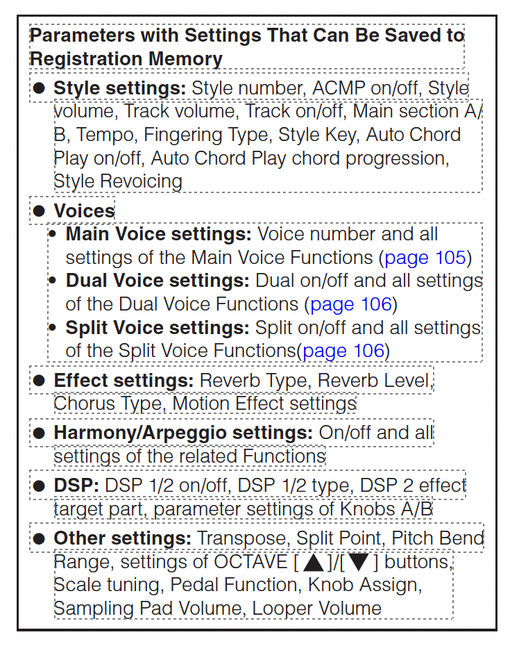 - Registration Memory: 256 registration memory slots vs 32 on the Yamaha, AND the slots are nameable!