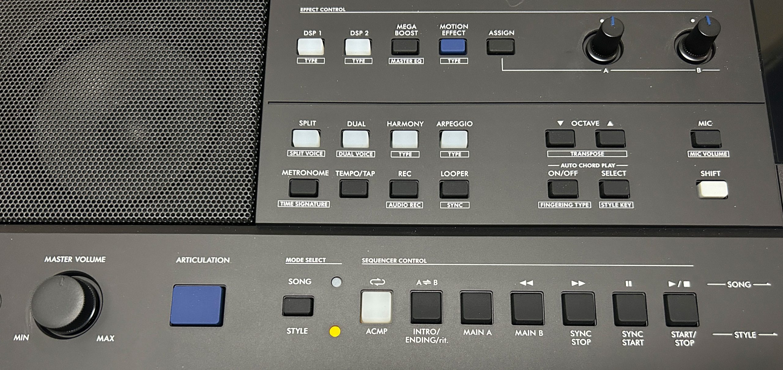 - DSP1 parameters: what the buttons will do here depends on the effect chosen; you can look up all the available effects and parameters in the Data List PDF on Yamaha’s website; as a quick example if I choose the Gospel Shout organ voice, Knob A will control the rotary speaker speed and knob B will control the balance between the bass and tweeter rotary speakers
